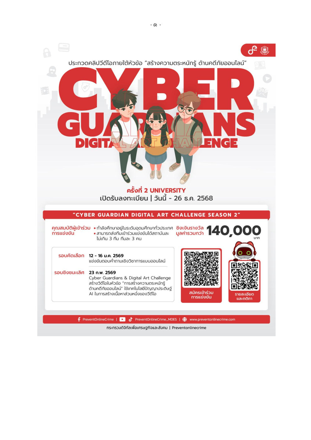สำนักงานปลัดกระทรวงดิจิทัลเพื่อเศรษฐกิจและสังคม ซึ่งเป็นหน่วยงานหลักในการกำกับดูแลการปฏิบัติตาม พระราชบัญญัติว่าด้วยการกระทำความผิดเกี่ยวกับคอมพิวเตอร์ พ.ศ. 2550 และที่แก้ไขเพิ่มเติม (ฉบับที่ 2) พ.ศ. 2560 จัดกิจกรรมการแข่งขัน Cyber Guardians Digital Art Challenge ครั้งที่ 2 (University) เพื่อส่งเสริมการสร้างความตระหนักรู้ด้านภัยออนไลน์ควบคู่ไปกับการพัฒนาทักษะดิจิทัล โดยการนำ เทคโนโลยี AI มาใช้ในการสร้างสรรค์ผลงาน