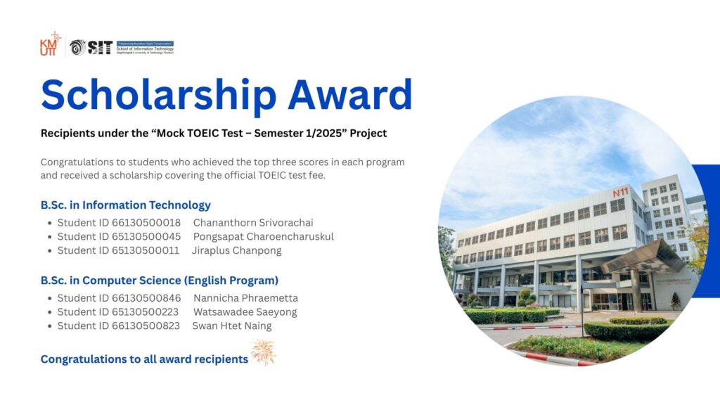 The School of Information Technology would like to congratulate the following students who achieved the top three scores in each program in the Mock TOEIC Test, Semester 1/2025.