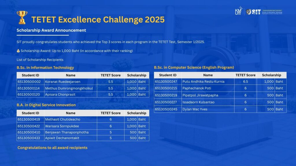 The School of Information Technology would like to congratulate the following students who achieved the top three scores in each program in the TETET Test, Semester 1/2025.