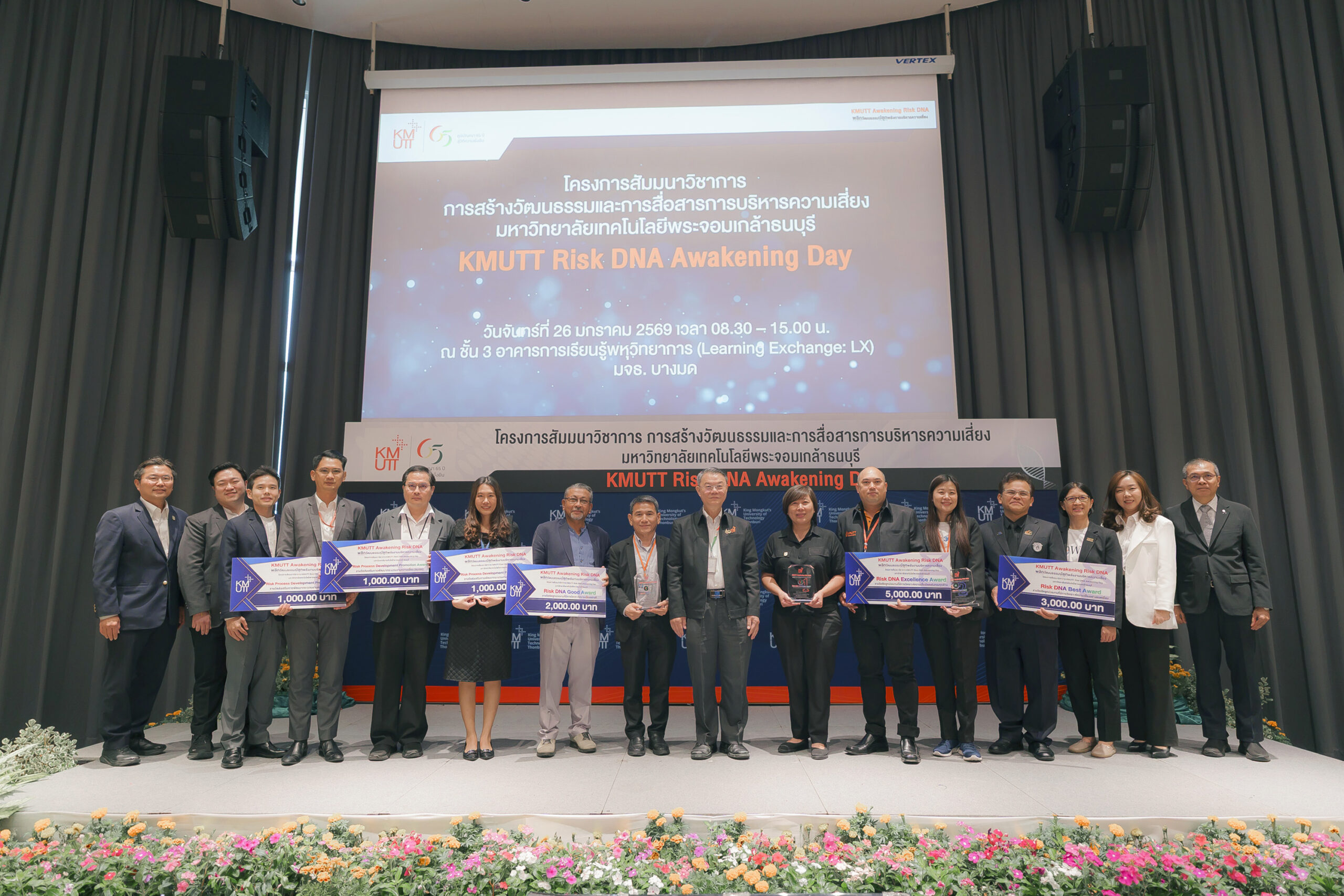 วันที่ 26 มกราคม 2569 มหาวิทยาลัยเทคโนโลยีพระจอมเกล้าธนบุรี (มจธ.) จัดโครงการสัมมนาวิชาการ “KMUTT Risk DNA Awakening Day” ณ ห้อง Auditorium ชั้น 3 อาคารพหุวิทยาการ (LX) เพื่อขับเคลื่อนวัฒนธรรมการบริหารความเสี่ยงอย่างเป็นระบบ โดยได้รับเกียรติจาก รศ. ดร.สุวิทย์ แซ่เตีย อธิการบดี เป็นประธานในพิธี ความโดดเด่นของงานในปีนี้ คือการแข่งขันวิเคราะห์ความเสี่ยงของหน่วยงานต่าง ๆ ภายในมหาวิทยาลัย ซึ่ง คณะเทคโนโลยีสารสนเทศ (SIT) สามารถทำผลงานได้อย่างยอดเยี่ยม ผ่านการคัดเลือกเข้าสู่รอบ 6 ทีมสุดท้าย และร่วมแสดงวิสัยทัศน์ในช่วง Pitching บนเวทีในวัดปิดโครงการ โดยมี ผศ. ดร.อุมาพร สุภสิทธิเมธี รองคณบดีด้านบริหาร เป็นผู้นำเสนอแผนยุทธศาสตร์การบริหารความเสี่ยงของคณะ ด้วยการวิเคราะห์ที่เฉียบคมและเป็นรูปธรรม ส่งผลให้คณะ SIT คว้ารางวัล Risk DNA Best Award (รางวัลรองชนะเลิศอันดับ 1) ซึ่งเป็นรางวัลเชิดชูหน่วยงานที่มีการวิเคราะห์ความเสี่ยงอย่างยอดเยี่ยม โดย ผศ. ดร.อุมาพร ได้กล่าวถึงนิยามของการบริหารความเสี่ยงในยุคใหม่ไว้ว่า “การบริหารความเสี่ยงที่ดี ไม่ได้ทำให้องค์กรปลอดภัยขึ้นอย่างเดียว แต่ทำให้องค์กรตัดสินใจได้ดีขึ้น เร็วขึ้น และมั่นใจขึ้น… ควบคุมและติดตามแล้ว องค์กรต้องเติบโตด้วย”
