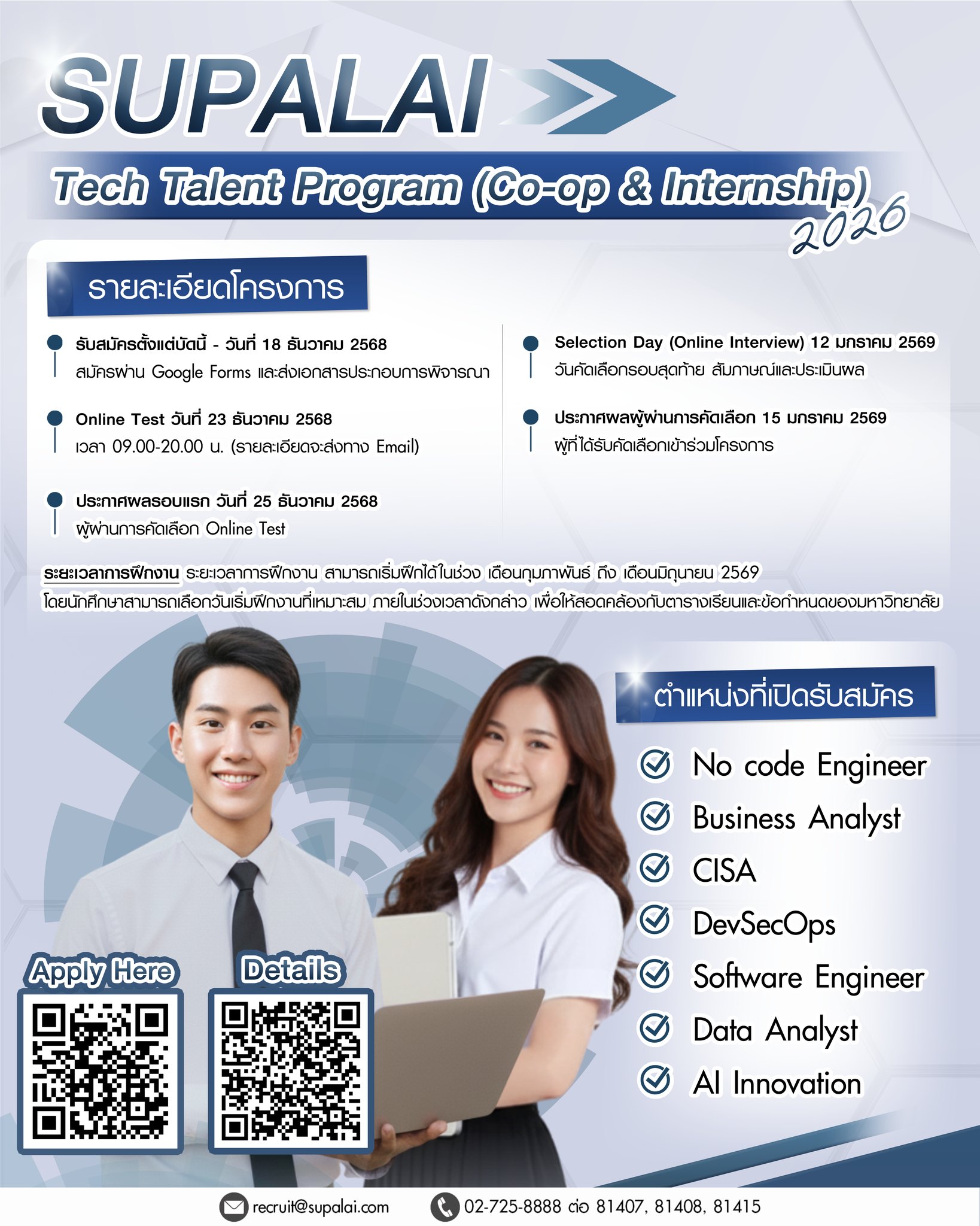 บริษัท ศุภาลัย จำกัด (มหาชน) ในฐานะผู้นำในธุรกิจอสังหาริมทรัพย์และมุ่งเน้นการขับเคลื่อนองค์กรด้วยนวัตกรรมและเทคโนโลยี (Tech-Driven Organization) มีความประสงค์ขอความอนุเคราะห์จากท่านเพื่อประชาสัมพันธ์ โครงการ SUPALAI Tech Talent Program 2026 (Co-op & Internship) เพื่อเปิดโอกาสให้นิสิตนักศึกษาผู้มีความสามารถด้านเทคโนโลยีได้เข้าร่วมฝึกประสบการณ์วิชาชีพกับทีมงานมืออาชีพของเรา ตามรายละเอียดดังนี้