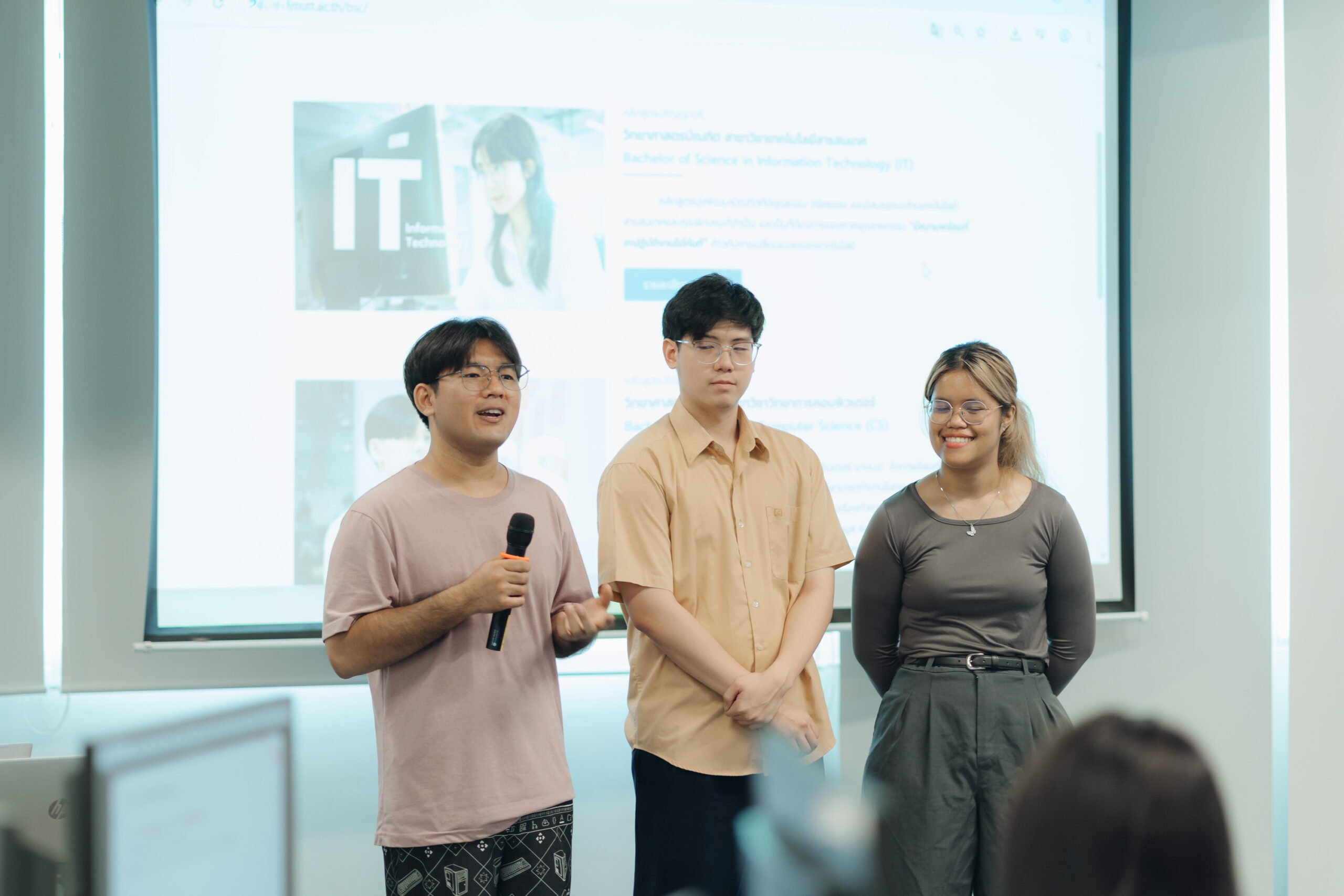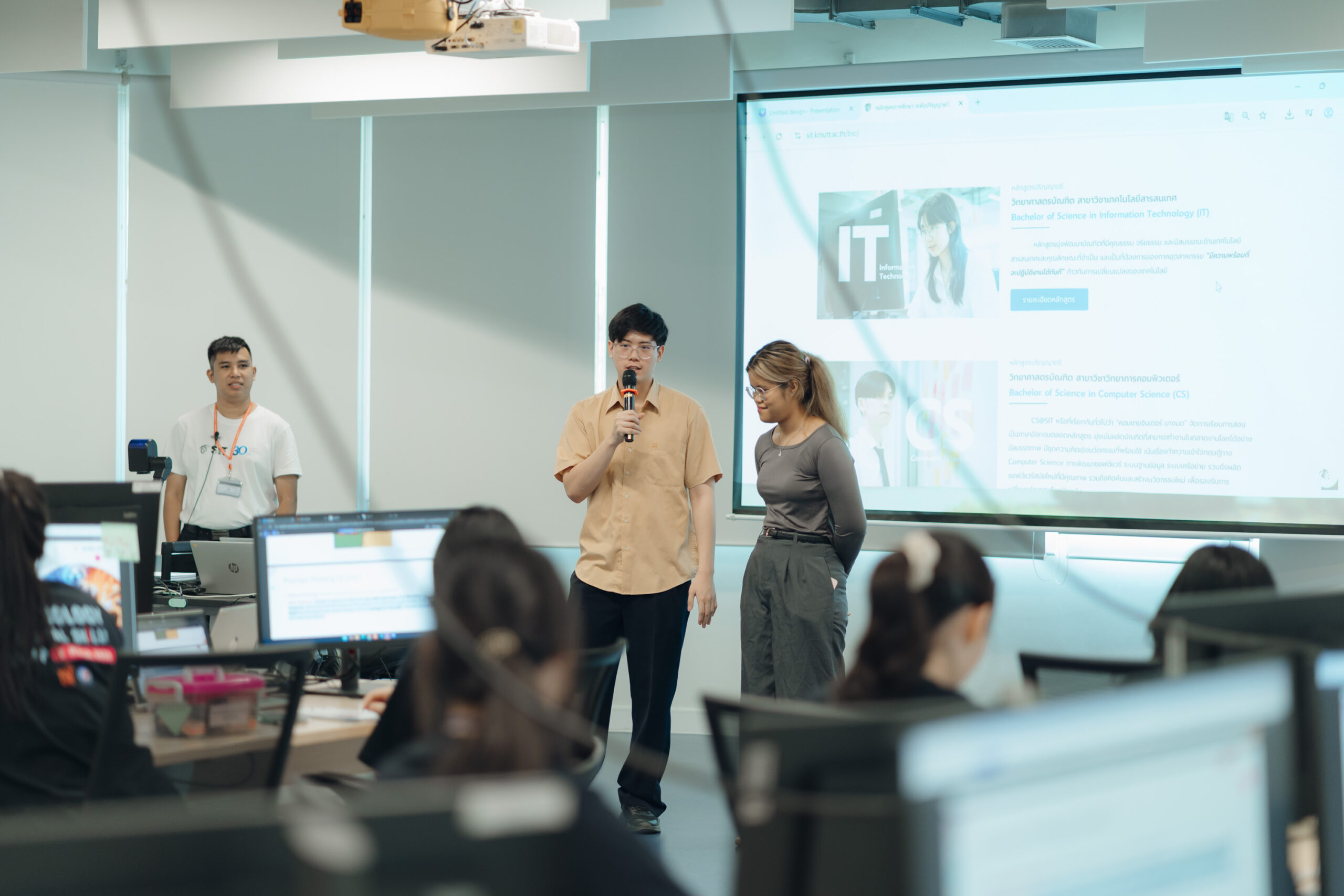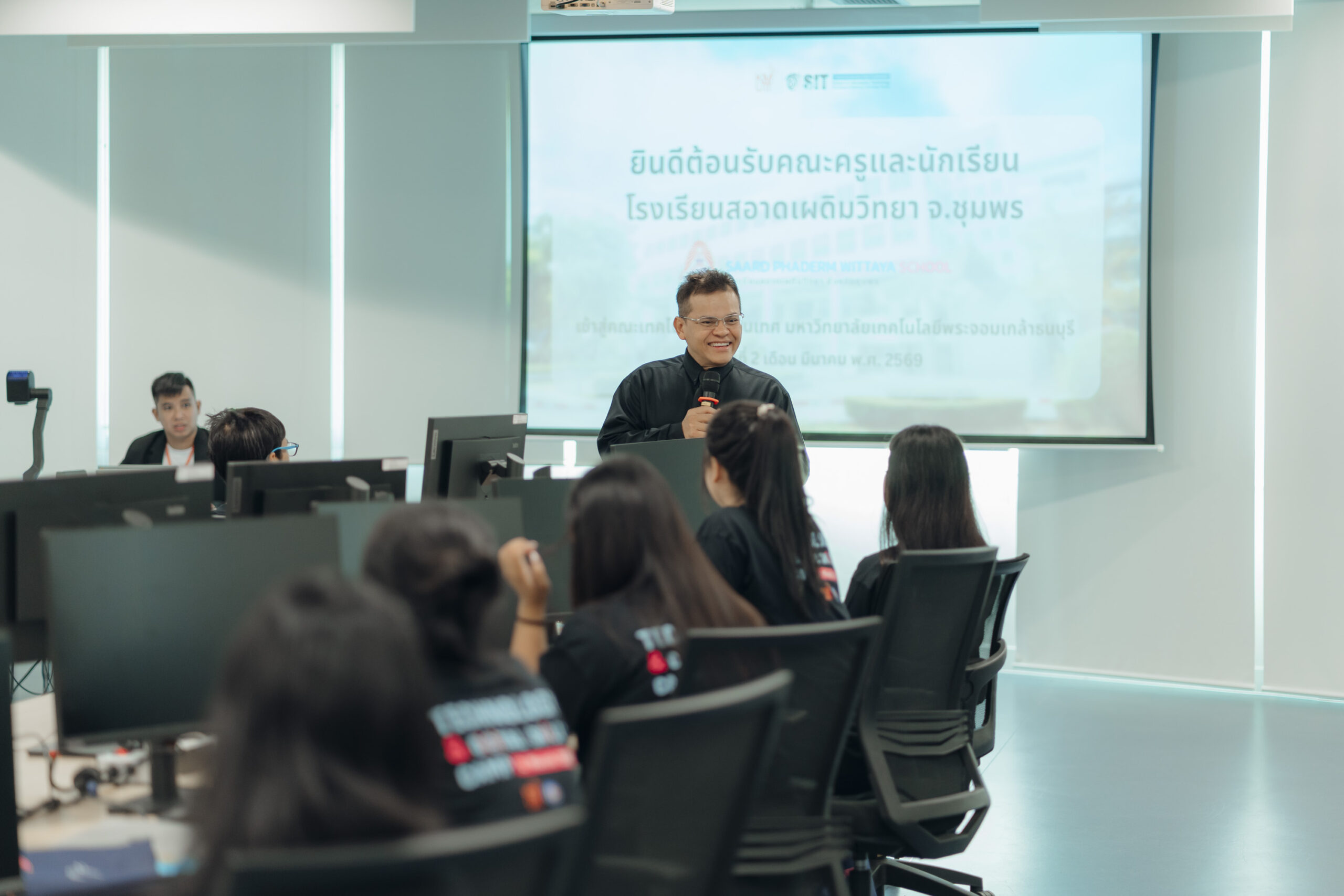 คณะเทคโนโลยีสารสนเทศ (SIT) มหาวิทยาลัยเทคโนโลยีพระจอมเกล้าธนบุรี (มจธ.) เปิดบ้านต้อนรับคณะครูและนักเรียนจาก โรงเรียนสอาดเผดิมวิทยา เมื่อวันจันทร์ที่ 2 มีนาคม 2569 ที่ผ่านมา ในกิจกรรมเยี่ยมชมและศึกษาดูงานเพื่อเตรียมความพร้อมสู่ระดับอุดมศึกษา ณ ศูนย์พัฒนาสมรรถนะสากล (GCDC) คณะศิลปศาสตร์ โดยได้รับเกียรติจาก ผศ. ดร.ณรงค์ฤทธิ์ วราภรณ์ คณบดีคณะเทคโนโลยีสารสนเทศ เป็นประธานกล่าวเปิดงานและต้อนรับคณะผู้เข้าเยี่ยมชมอย่างอบอุ่นไฮไลต์กิจกรรมสำคัญของงานคือการอัปเกรดทักษะดิจิทัลผ่านเวิร์กชอปหัวข้อ “AI Power up” ซึ่งได้รับเกียรติจาก คุณธนทัต วงษ์เอบุษ นักวิจัยจาก SIT มาเป็นวิทยากรผู้เชี่ยวชาญในการถ่ายทอดความรู้เกี่ยวกับการประยุกต์ใช้ Generative AI ในเชิงสร้างสรรค์ เพื่อให้นักเรียนสามารถนำ AI ไปใช้เป็นผู้ช่วยในการเรียนรู้ (Study Smarter) และเพิ่มขีดความสามารถในการสร้างสรรค์ผลงาน (Create Faster) ได้อย่างมีประสิทธิภาพ  นอกจากทักษะด้าน AI แล้ว น้อง ๆ ยังได้รับฟังการแนะแนวหลักสูตรและแลกเปลี่ยนประสบการณ์แบบเจาะลึกจากรุ่นพี่ตัวแทนทั้ง 3 สาขา ได้แก่ IT, CS และ DSI เพื่อสร้างแรงบันดาลใจและแนวทางในการเลือกเรียนต่อในสายงานดิจิทัลที่ใช่สำหรับตนเองในอนาคต