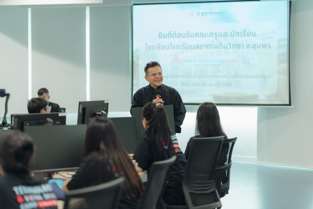 คณะเทคโนโลยีสารสนเทศ (SIT) มหาวิทยาลัยเทคโนโลยีพระจอมเกล้าธนบุรี (มจธ.) เปิดบ้านต้อนรับคณะครูและนักเรียนจาก โรงเรียนสอาดเผดิมวิทยา เมื่อวันจันทร์ที่ 2 มีนาคม 2569 ที่ผ่านมา ในกิจกรรมเยี่ยมชมและศึกษาดูงานเพื่อเตรียมความพร้อมสู่ระดับอุดมศึกษา ณ ศูนย์พัฒนาสมรรถนะสากล (GCDC) คณะศิลปศาสตร์ โดยได้รับเกียรติจาก ผศ. ดร.ณรงค์ฤทธิ์ วราภรณ์ คณบดีคณะเทคโนโลยีสารสนเทศ เป็นประธานกล่าวเปิดงานและต้อนรับคณะผู้เข้าเยี่ยมชมอย่างอบอุ่นไฮไลต์กิจกรรมสำคัญของงานคือการอัปเกรดทักษะดิจิทัลผ่านเวิร์กชอปหัวข้อ “AI Power up” ซึ่งได้รับเกียรติจาก คุณธนทัต วงษ์เอบุษ นักวิจัยจาก SIT มาเป็นวิทยากรผู้เชี่ยวชาญในการถ่ายทอดความรู้เกี่ยวกับการประยุกต์ใช้ Generative AI ในเชิงสร้างสรรค์ เพื่อให้นักเรียนสามารถนำ AI ไปใช้เป็นผู้ช่วยในการเรียนรู้ (Study Smarter) และเพิ่มขีดความสามารถในการสร้างสรรค์ผลงาน (Create Faster) ได้อย่างมีประสิทธิภาพ  นอกจากทักษะด้าน AI แล้ว น้อง ๆ ยังได้รับฟังการแนะแนวหลักสูตรและแลกเปลี่ยนประสบการณ์แบบเจาะลึกจากรุ่นพี่ตัวแทนทั้ง 3 สาขา ได้แก่ IT, CS และ DSI เพื่อสร้างแรงบันดาลใจและแนวทางในการเลือกเรียนต่อในสายงานดิจิทัลที่ใช่สำหรับตนเองในอนาคต